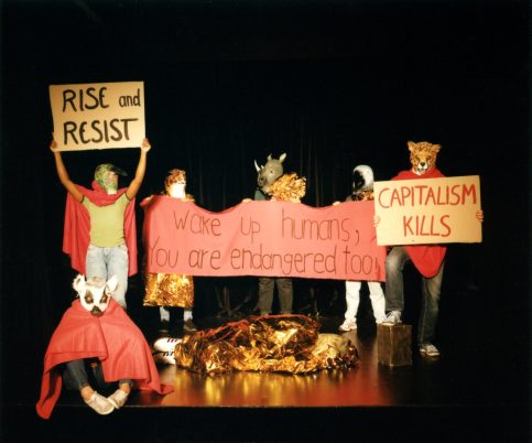 Eine Assemblage aus Körpern, Objekten und Zitaten. Auf einer Bühne werden sichtbare und unsichtbare Grenzen von Darstellern und Tricksern manipuliert und überschritten, die die Idee der ökologischen Gerechtigkeit für Menschen, Monarchfalter und andere wandernde Populationen in einer geteilten Welt verankern.